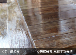 当社では天然の桐の種から抽出した最高級の桐油を使用しています。桐油は雨水を拭き取った際の防水性にもっとも優れ、古くから社寺建築の縁板や階に塗りこませて木材を保護してきました。また「拭き漆」に比べて安価な上、何より紫外線に強いので、建物の外部施工に適しています。多くのお客様にご好評いただいている施工技術です。ぜひ一度お試しいただければ幸いです。