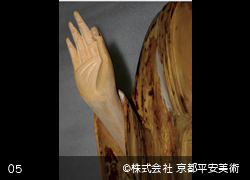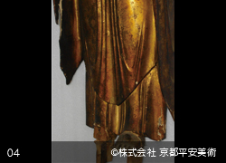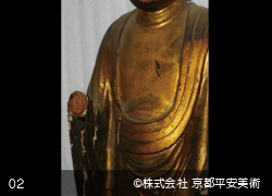 ご存知のように京都の地には、国宝や重要文化財指定を受けた貴重な価値を有する仏像が数多く現存し、古くから京職人たちは「歴史の重みと誇りを大切にする」という文化の中で育ちました。このような地で修復の仕事をさせていただいている以上、当社は「時代を経てきたものの美しさや魅力を重んじていきたい」という思いを強く持っています。それは、造立当初の新品同様の姿の再現を望まれた場合も同じで、「どうすれば歳月とともに良さが滲みでてくるような修復ができるか」を常に己に問いかけながら修復に努めています。当社の修復方法には、「造立時の姿を再現する修復」だけでなく、「現状保存に重点をおいた修復」、「金箔や彩色部分を少し落ち着きのある雰囲気に仕上げる修復」など、様ざまな方法からご要望にお応えできる修復をさせていただいています。