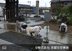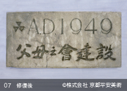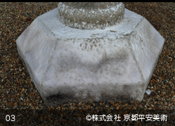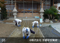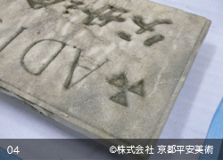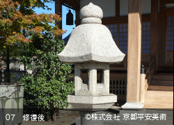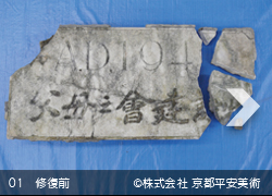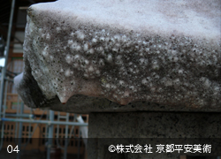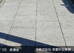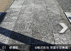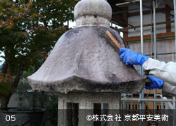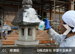 当社では、様ざまな文化財修復のほかに、木質や石質の洗浄も承っています。発生した黒カビの根が入り込み、また汚れがひどい参道の石畳や石灯。これを綺麗にするのは無理だと石屋さんが諦めるような頑固な汚れでも、当社の職人は人と環境に優しい洗浄剤を使用し、様ざまな洗浄技法を駆使し、手間をいとわず、丹念に汚れを落とし、美しく仕上げます。また、壊れてしまった石碑や表面が剥離した墓石や石碑などの修復もお気軽にお問い合わせください。