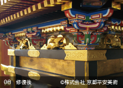 いにしえより神事や祭事に用いられ、信仰の対象としても多くの感動を誘ってきた鉾や山車、お神輿は、芸術性にも優れていて、彫刻・彩色漆塗り・金箔・錺金具など様ざまな装飾箇所から成り立っています。しかし経年とともに様ざまな箇所に痛みが出やすく、お直しするには修復箇所に応じた職人の技術が必要になります。当社では、ネットワークを組む多くの職人と長く培ってきた技術や経験を活かして、どんな修復にも対応します。私たちの願いは、先人たちの熱い想いを次の世代に引き継ぐためのお手伝いをすることです。
