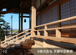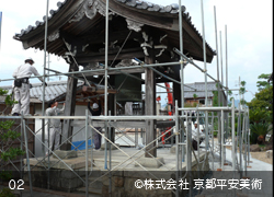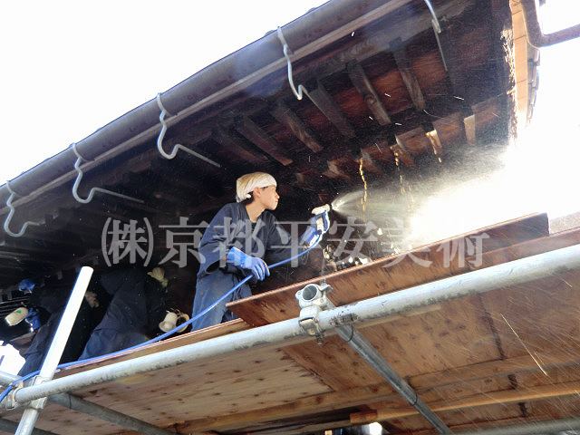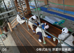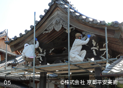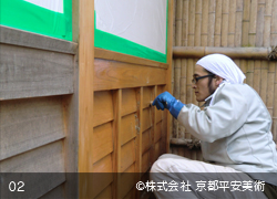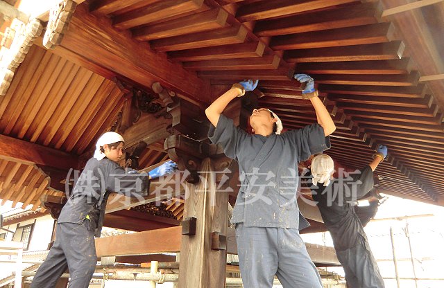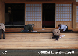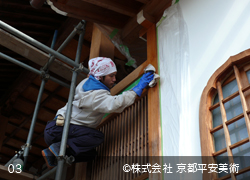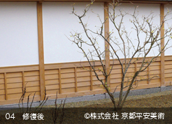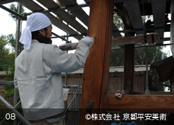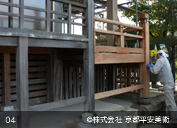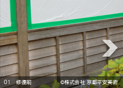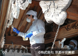 京都平安美術の「洗浄修復」は、木材に付着したカビや汚れを除去するだけでなく、経年劣化した木材の傷や亀裂箇所・虫穴などを、修復した跡が判らないほど丁寧に直すことから始めます。また、文化財修復を得意とする当社では、美しく洗浄した木材に最適の意匠(デザイン)で錺金具を新調することや、木口の胡粉塗り、彫物の彩色など、様ざまな提案をさせていただくことが可能です。すべての工程が完了すれば、美しいままの状態で長期間保存出来るように、木材表面に撥水保護材を浸透させて仕上げます。