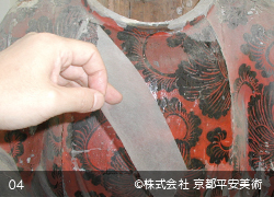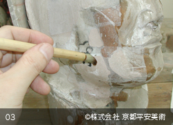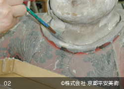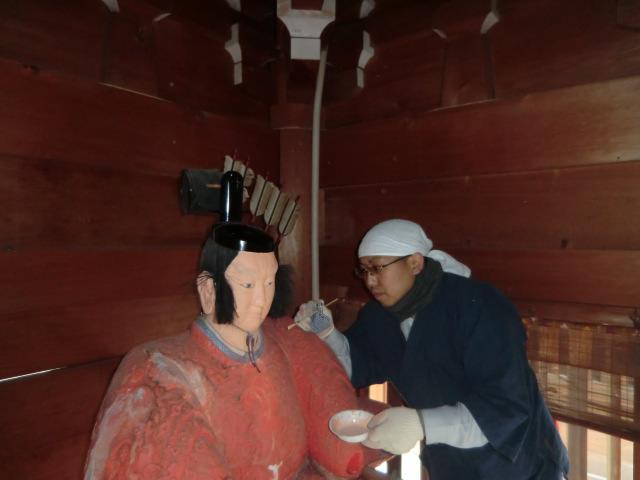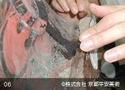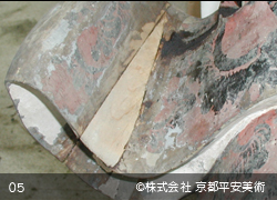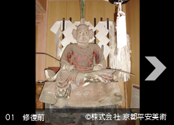 ご神像や随身像など、お祈りの対象になるものを修復する際には、その土地の歴史や文化、特に大切にお守りされ、受け継いでこられた全ての方がたのお気持ちを尊重しながら、慎重かつ丁寧に修復させていただいています。当社の修復には、全解体修復、部分解体修復、現状保存修復など様ざまですが、木地や塗膜の現状を調査した後に最適の修復技法を提案いたします。