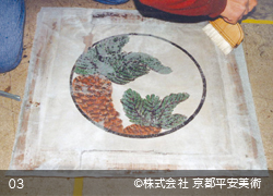 京都平安美術の「天井画修復」は、ただ剥がれた絵画の上に絵を描き直すのでなく、周到な調査から始まります。木部修理、捨て膠などの工程を経て下地を完成させた後、塗膜成分検査や図柄調査、白描図や彩色復元図を作成します。その後ようやく絵画部分の修復にとりかかります。